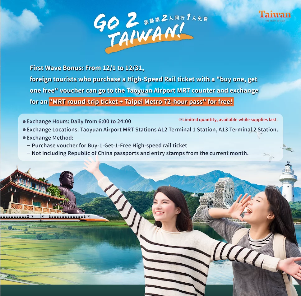 L’achat d’un billet aller simple pour le train à grande vitesse de Taiwan (Taiwan High Speed Train) vers Taichung, Changhua, Yunlin, Chiayi, Tainan, ou Zuoying (Kaohsiung), entre le 1er décembre 2023 et le 31 mai 2024, permet à tout touriste étranger de recevoir un second billet gratuit pour le même itinéraire, destiné à une personne accompagnante.