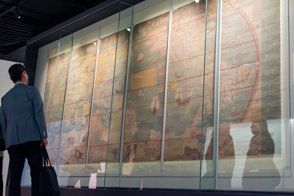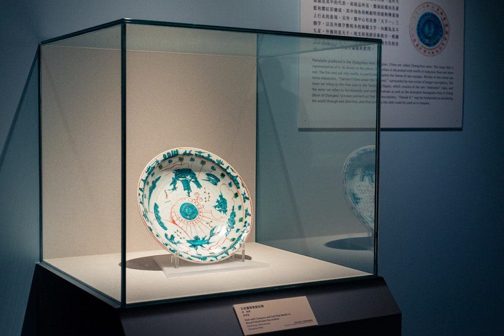 Parmi les pièces remarquables de l’exposition, on trouve une carte marine datant des années 1560, une assiette en porcelaine décorée d’hexagrammes chinois provenant du musée Guimet de Paris, ainsi qu’un vase en forme de dragon du Rijksmuseum d’Amsterdam.