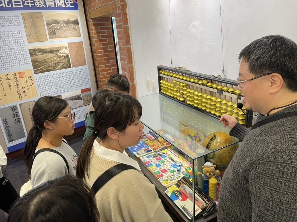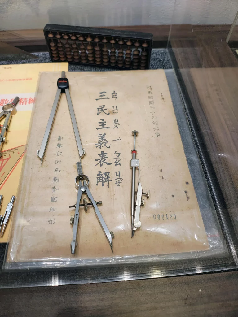 Les visiteurs peuvent également explorer une variété d’outils pédagogiques utilisés entre les années 1950 et 1980. Parmi ces artefacts figurent des duplicateurs à stencil des années 1950, de grands abacs des années 1960, des globes terrestres et des grandes équerres des années 1970, ainsi que des puzzles représentant la République de Chine (中華民國) et l’île de Taïwan.