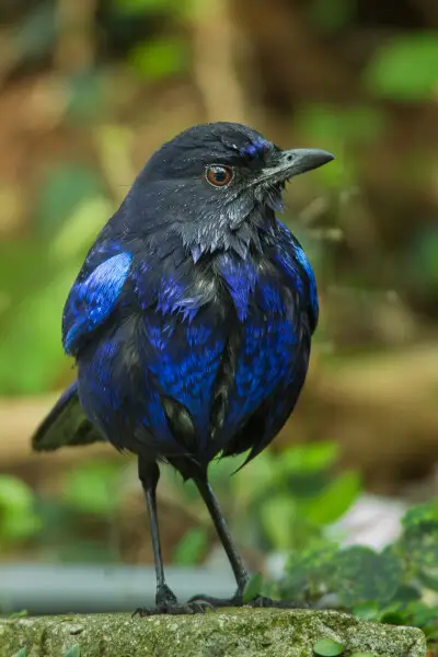 Avec ses 30 cm et sa robe bleu sombre parsemée de reflets métalliques, il attire l’œil des observateurs attentifs. Son chant, mélange de sifflements doux, de sons stridents et de notes imitant parfois des mots humains, est reconnaissable au lever du jour. Il n’existe pas de différence visuelle notable entre mâle et femelle. L’oiseau utilise son plumage pour la parade et pour affirmer sa présence dans son territoire forestier.