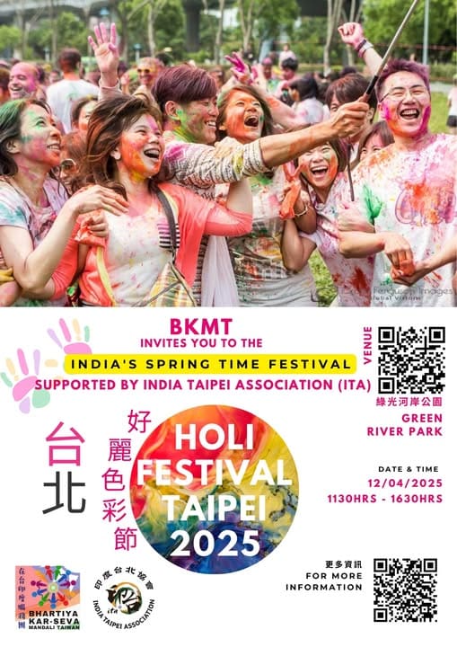 Le Bhartiya Kar-Seva Mandali Taiwan (BKMT), avec le soutien de l’India Taipei Association (ITA), vous invite à célébrer le Holi Festival Taipei 2025, un événement haut en couleurs et en joie. Gratuit et ouvert à tous, ce rendez-vous aura lieu le samedi 12 avril 2025 de 11h30 à 16h00 au Green River Park 綠光河岸公園. Il suffit de s’inscrire à l’avance pour obtenir son billet gratuit et participer à cette fête incontournable de la culture indienne.