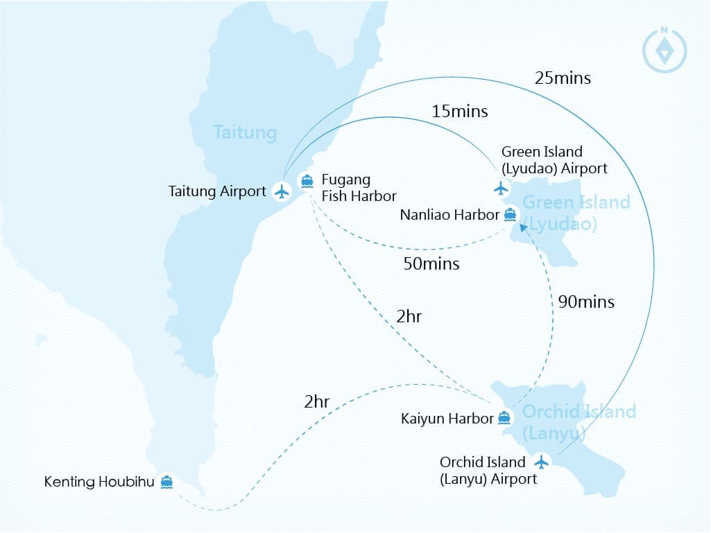 Green Island est une île située à 33 km au large de Taitung, sur la côte est de Taïwan. Accessible en avion ou bateau depuis Taitung, il vous faudra respectivement 15 min depuis l’aéroport ou 50 min depuis l’embarcadère de Fugang – plusieurs compagnies de ferry proposent des trajets quotidiennement. Vous pouvez vous rendre sur ce site pour obtenir les horaires, tarifs et infos pratiques des avions et ferry. Attention au mal de mer à bord des ferrys car les vagues sont souvent grosses (>1,5-2m).