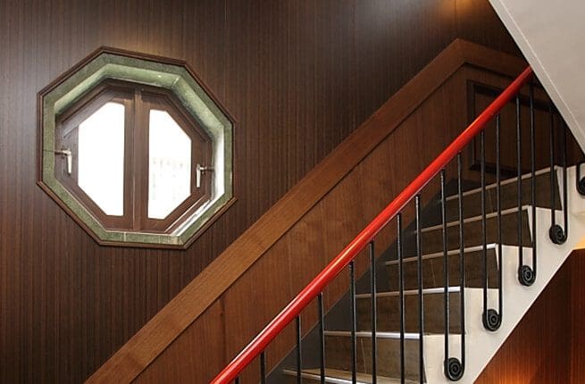 Le Starbucks Yi 14 est situé dans un bâtiment baroque de 1950, qui s’apprécie mieux de l’extérieur – vous devrez traverser la rue pour avoir une vue sur l’ensemble du bâtiment. À l’intérieur, il n’y a rien de très spécial sur le plan architectural, à l’exception des fenêtres octogonales uniques, du fer rouge sur l’escalier et du sol en pierre d’origine.