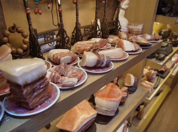 Pour terminer notre sélection, nous vous proposons le cadeau le plus surprenant et le plus inutile de la liste. Des pierres en forme de viande ! Cette variété de jaspe à bandes, formée de couches de cristaux étrangement rose chair et blanc translucide, ressemble étrangement à un morceau de poitrine de porc ou à un steak richement marbré. Vous pouvez en trouver en vente au Musée national du palais de Taipei. Cependant, ne vous laissez pas trop emporter, ou vous pourriez finir par devoir débourser un supplément pour les bagages en surpoids sur le chemin du retour !!!