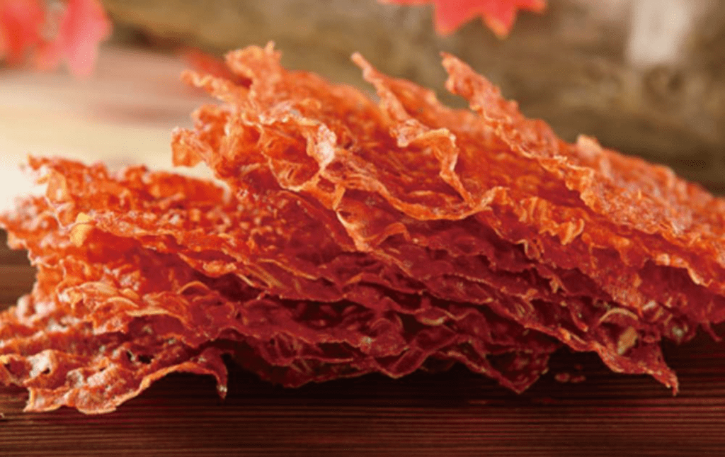 Cette spécialité Taïwanaise est une charcuterie qui serait le croisement entre du porc séché et des chips. Cette collation croustillante est très appréciée des asiatiques. La recette de base est un mélange de porc haché, de sauce soja, de vin de cuisine et de cinq épices en poudre, cuit étalé en une fine couche, jusqu’à ce qu’il soit brillant et croustillant. Il en existe différentes variétés, épicée, pimentée et certains vendeurs en proposent même des versions sucrées salées avec des morceaux de pomme ou d’amande. Idéal pour les amateurs d’apéritifs et les foodies qui cherchent toujours de nouveaux gouts à tester. Et cela s’accompagne parfaitement d’une bonne bière ou d’un verre de vin de prune.