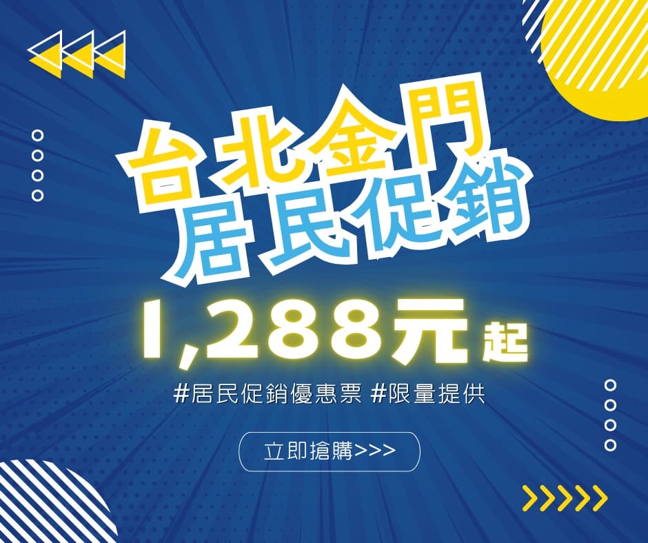 Des réductions sont prévues pour les résidents des îles périphériques de Taïwan (Kinmen, Penghu/Matsu). Si vous êtes domicilié sur ces îles, vous pouvez prétendre à des tarifs locaux préférentiels pour vos vols au départ ou à destination de votre île de résidence. Ainsi, un senior résidant à Kinmen/Penghu aura un tarif spécifique “résident senior”, et de même pour un résident handicapé, etc. Ces tarifs font partie de politiques d’aménagement du territoire pour faciliter les liaisons entre les îles et l’île principale.