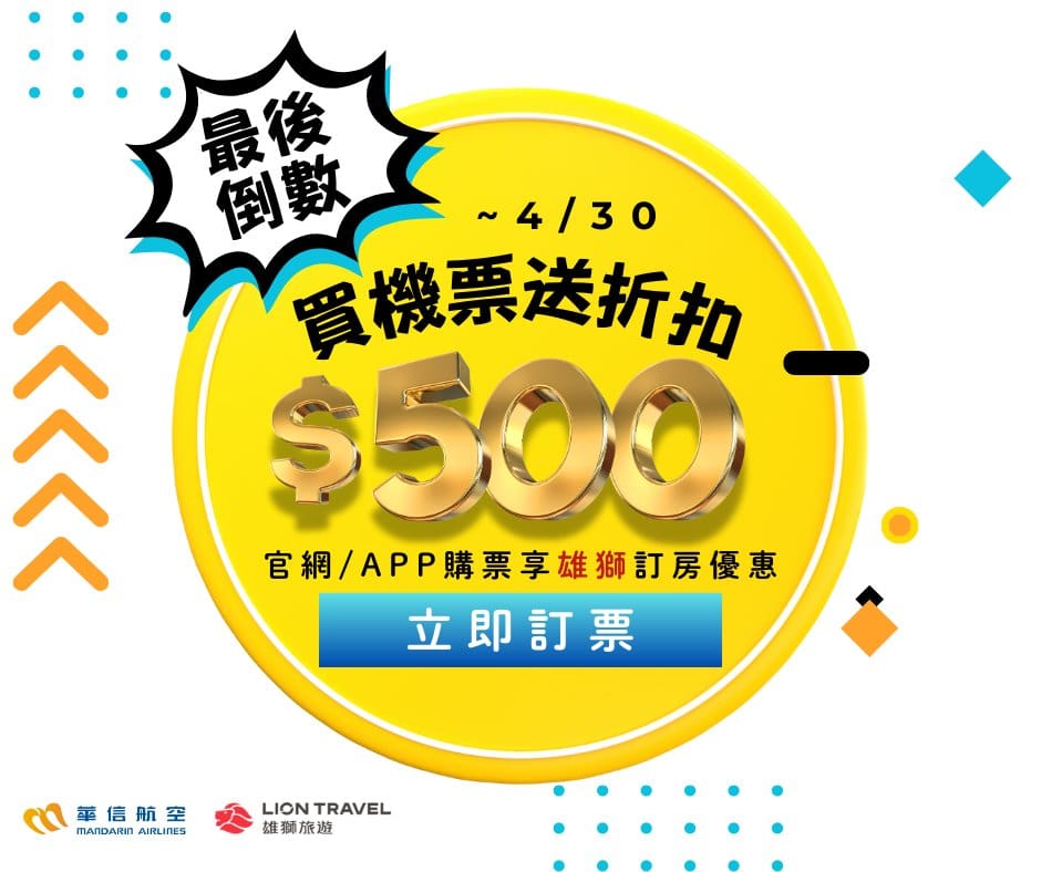 En fonction du calendrier, on observe des campagnes promo saisonnières. Par exemple, des réductions pour encourager le tourisme vers les îles en été, ou des offres “early spring” pour remplir les vols juste après le Nouvel An chinois. En basse saison (entre les grandes vacances d’été et Noël), Mandarin Airlines propose souvent des billets à tarifs réduits, parfois sous forme de codes promo publiés sur le site ou l’app. Une promo type qui est souvent proposée est la suivante : « 500 NT$ offerts sur tout achat de 5000 NT$ de billets » pendant un mois donné, diffusée via les canaux en ligne de la compagnie.
