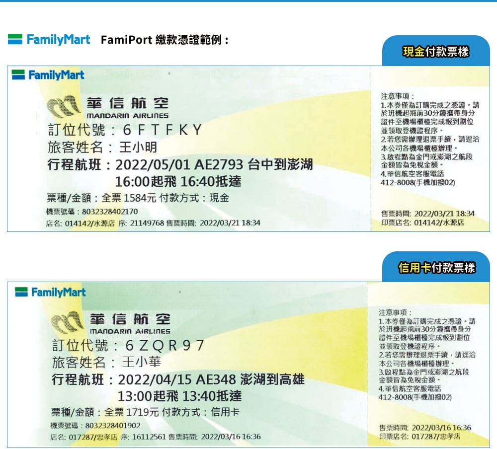 - Chez FamilyMart : passe par FamiPort. Le fonctionnement est similaire : recherche Mandarin Airlines, entre les informations de vol ou ton code de réservation, et imprime le reçu. Tu peux payer sur place ou confirmer une réservation faite en ligne.