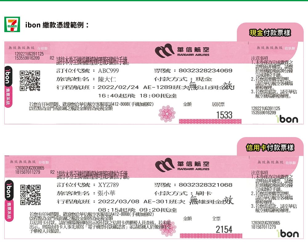 Mandarin Airlines facilite la réservation et le paiement de billets grâce à ses partenariats avec les chaînes de supérettes taïwanaises comme 7-Eleven (via ibon) et FamilyMart (via FamiPort). Ce service est pratique pour ceux qui préfèrent payer en espèces, qui n’ont pas de carte bancaire taïwanaise, ou qui réservent en dernière minute.