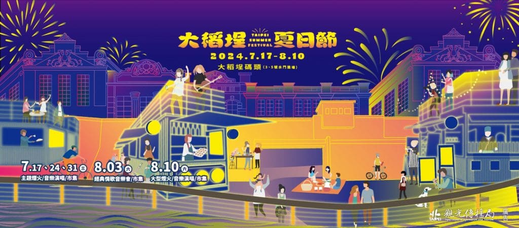Le « Festival d’Été de Taipei 2024 », l’événement estival le plus emblématique de Taïwan, se déroulera du 17 juillet au 10 août à Dadaocheng Wharf. Le Département de l’Information et du Tourisme de la ville de Taipei a annoncé que le festival de cette année présentera quatre spectacles de feux d’artifice thématiques et cinq concerts de musique. Les rives de la ville seront illuminées par des éclairages décoratifs, mettant en valeur le charme unique de Taipei lors des nuits d’été.