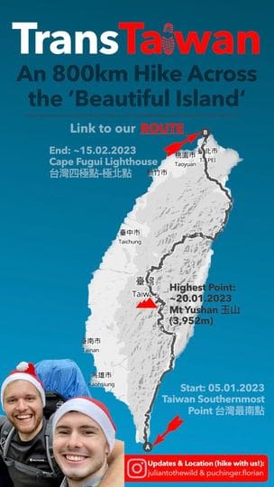 Il y a quelques mois, Julian et Florian ont entrepris un périple qui n’avait encore jamais été tenté. L’idée des deux randonneurs était de traverser l’île du nord au sud en passant par ses chaînes montagneuses. Bien que de nombreux sportifs fassent le tour de l’île à pied ou à vélo, cet itinéraire inédit a créé une vague de réactions variées dans la communauté outdoor locale. C’est en seulement quelques semaines et avec une planification énorme qu’est né le challenge de la Trans-Taïwan.